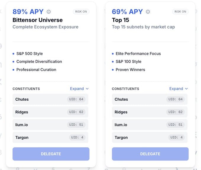 Bittensor Universe Index — covering 40+ subnets across the ecosystem for broad, one-click exposure to decentralized AI infrastructure.