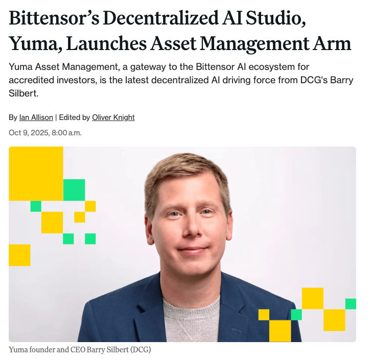 ⚡️ Yuma announced the launch of Yuma Asset Management, a platform that introduces managed subnet-token funds accessible to accredited investors and institutions to help gain diversified exposure into Bittensor subnets.